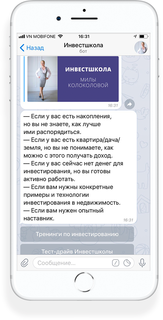 Ксения сделала с нуля чат-бот для Инвестшколы Милы Колоколовой. Полный восторг от результата и формата работы. Вопросы четкие и по делу, сроки реальные, предложения от Ксении - это уже готовая смесь из тренда, функционала и удобства. Помню как увидела первую схему по чат-боту, благо сидела. И понять все было сложно с первого раза, а чтоб создать - это высший пилотаж. Особенно отмечу самостоятельность в работе - нас не дёргали по мелочам, а все время предлагали выбрать или оценить готовое. Это очень ценно. На выходе получили шикарный чат-бот, тестовые запуски дали прекрасные отклики от клиентов, первые продажи и мелкие доработки, которые Ксения легко исправила. Рекомендуем обеими руками!