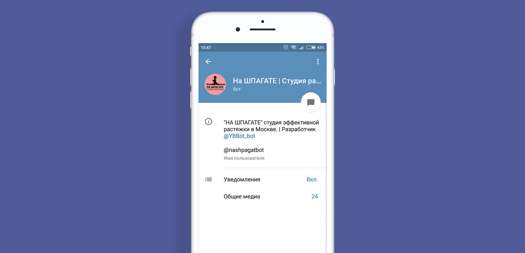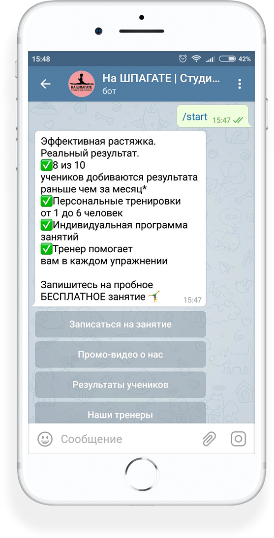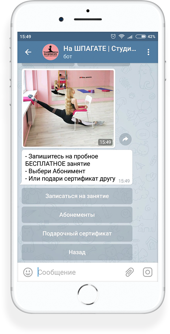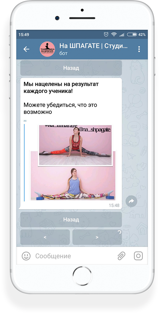 Основная функция бота - рассказать о студии растяжки "НА ШПАГАТЕ", а также показать результаты учеников. Ещё у пользователей есть возможность связаться со студией любым удобным способом: позвонить, перейти на сайт, написать в direct в Instagram и д.р.
