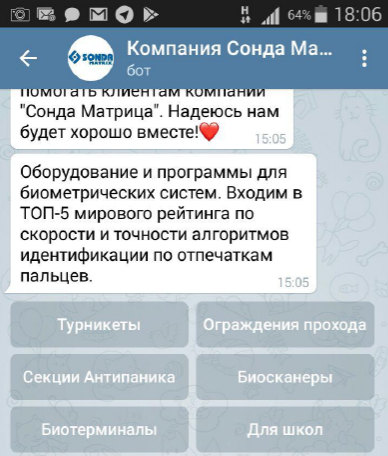 Я часто выезжаю на переговоры с клиентами. Давно хотел иметь под рукой, т.е. на смартфоне, хорошую мобильную версию нашего сайта. Обычный сайт медленно грузится и криво отображается. Нам предложили вариант чат-бота. Классно! То что нужно. Вся основная номенклатура товаров – под рукой, с картинками и гифками. Всегда можно показать клиенту. Уже одну продажу оборудования на 34 тысячи рублей с помощью бота сделал…